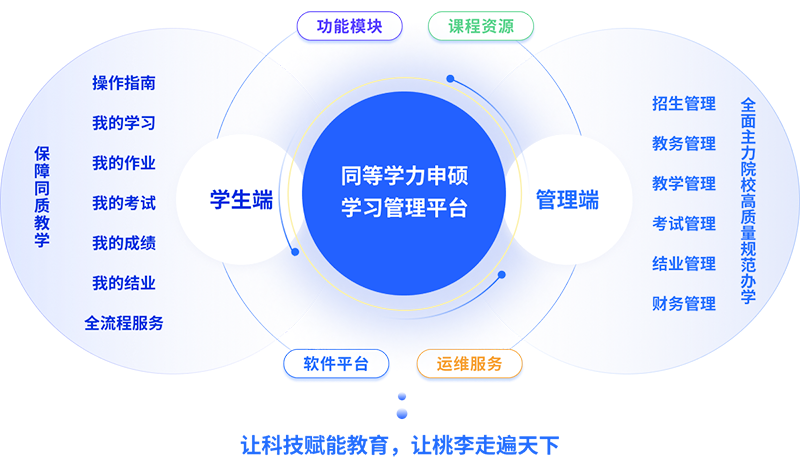 针对高校同等学力申硕教学管理需求,深入开展现代信息技术与网络教育融合模式的研究,基于大数据、人工智能等技术不断研发新产品,建设具有国内领先水平的网络教育产品体系,助力院校快速实现业务的智能化管理、网络化教学,保证院校业务高效稳定的开展。