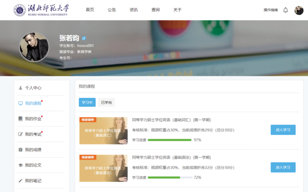 有效完成课件学习、在线作业/考试、提问答疑、论文写作等日常学习任务,实时进行毕业申请、通知查询、课程成绩查询、学籍查看等。